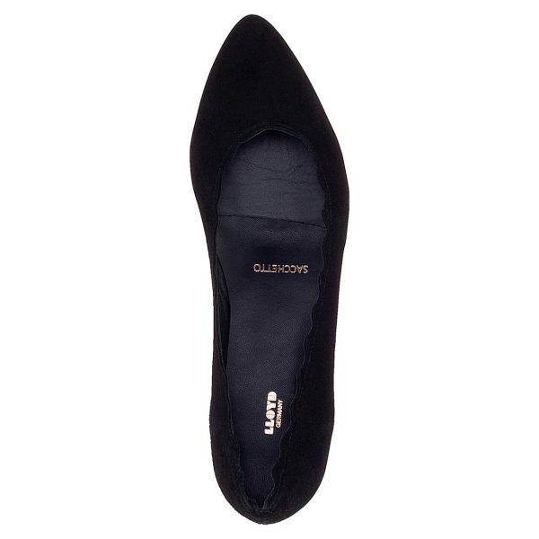 LLOYD präsentiert Ballerinas aus schwarzem Rauleder, die mit einer pflegeleichten Oberfläche begeistern. Dabei versprechen die Ballerinas mit Spitze ein modisches und feminines Auftreten. Durch die spitz zulaufende Schuhspitze in extravaganter Optik, wird eine modische Form erzeugt. Im Alltag bieten die Ballerinas mit Spitze einen sicheren Stand dank flachem Blockabsatz. Mit der rutschfesten Gummisohle wird der Auftritt beim Gehen ideal abgefedert, während die Innensohle aus Leder dabei ein hohes Wohlfühlpotenzial bietet. Für ein angenehmes Tragegefühl und ein schnelles Hineinschlüpfen sorgen der offene Einstieg und das weiche Rauleder. Mittels Lederfütterung sind die Ballerinas mit Spitze atmungsaktiv und bequem.