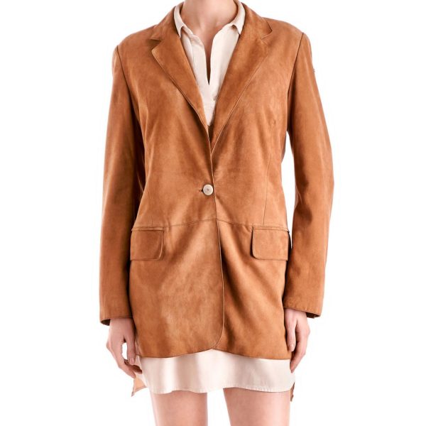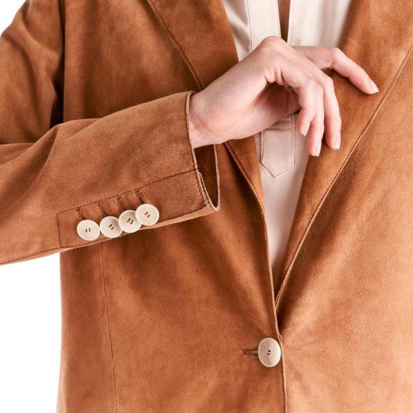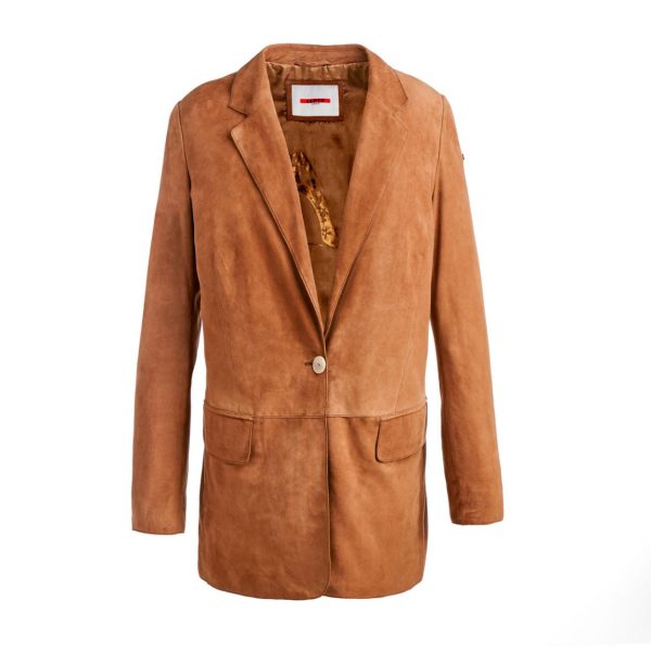 Der edle Raulederblazer „ELOISE“ von LLOYD ist ein echter Klassiker. Vorne hat der Blazer einen Knopf zum Schließen, am Ärmel sind Schlitze mit vier Knöpfen. Der Blazer ist modern und durch die braune Farbe zeitlos.