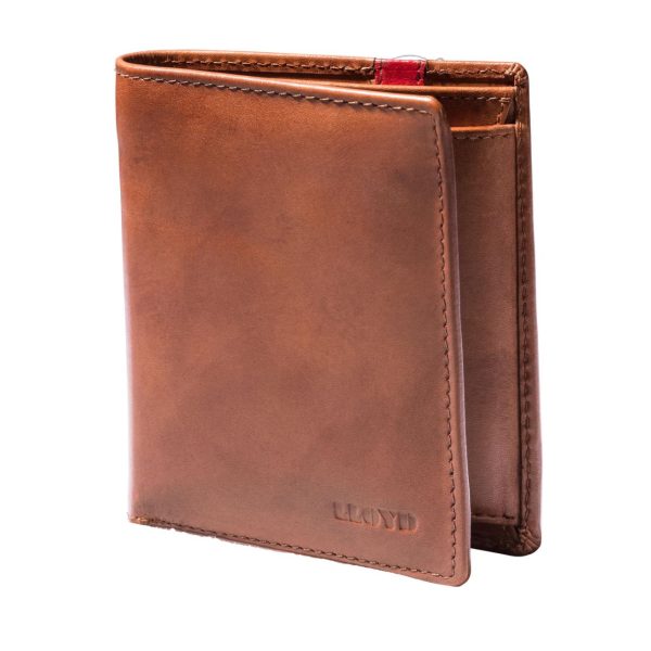 LLOYD präsentiert eine klassische Geldbörse in cognacfarbenen Glattleder. Im Inneren befindet sich ein Münzfach, vier Kartenfächer sowie ein großes Scheinfach mit rotem Lederstreifen.