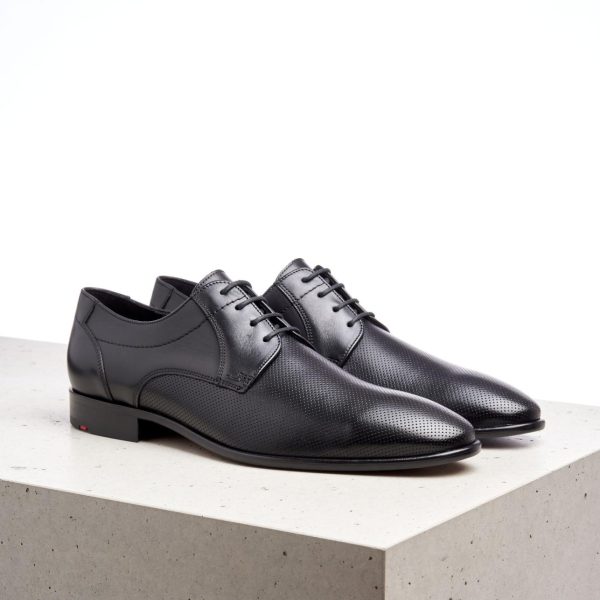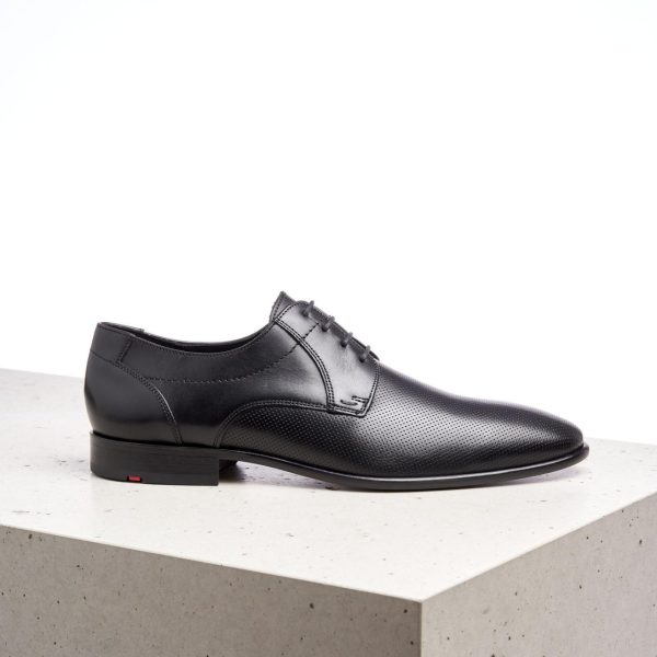 Moderner Cityschnürschuh auf einem hochwertigen Lederboden. Die zeitgeistige Leistenform verleiht dem Schuh seinen besonderen Charakter, gepaart mit dem ausdrucksstarken Obermaterial mit handwerklichem Finish entsteht ein hochwertiger Herrenbusinessschuh. Die dezente Prägung gibt dem Herrenschuh Saisonalität.